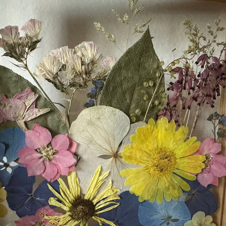 Květinový ručně vyrobený obraz s květy žlutých, růžových a modrých barviček, které rostou ze spodu obrazu. Mezi květy najdete hortenzie, chryzantému, ostrožky a mnoho dalšího.