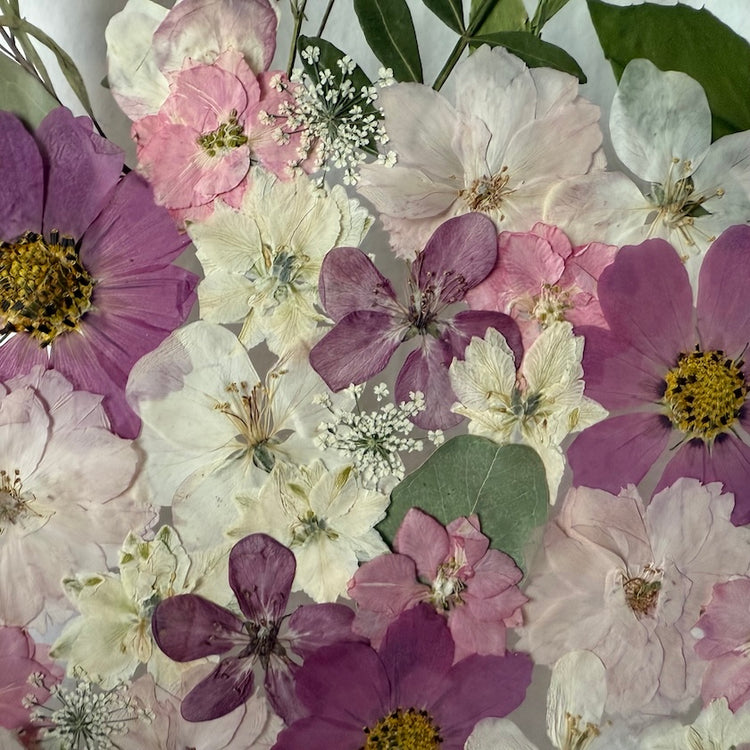 Květinový ručně vyrobený obraz s květy v růžových a bílých barvách, které rostou ze spodu obrazu. Mezi květy najdete růže, krásenky, květy třešní a mnoho dalšího.