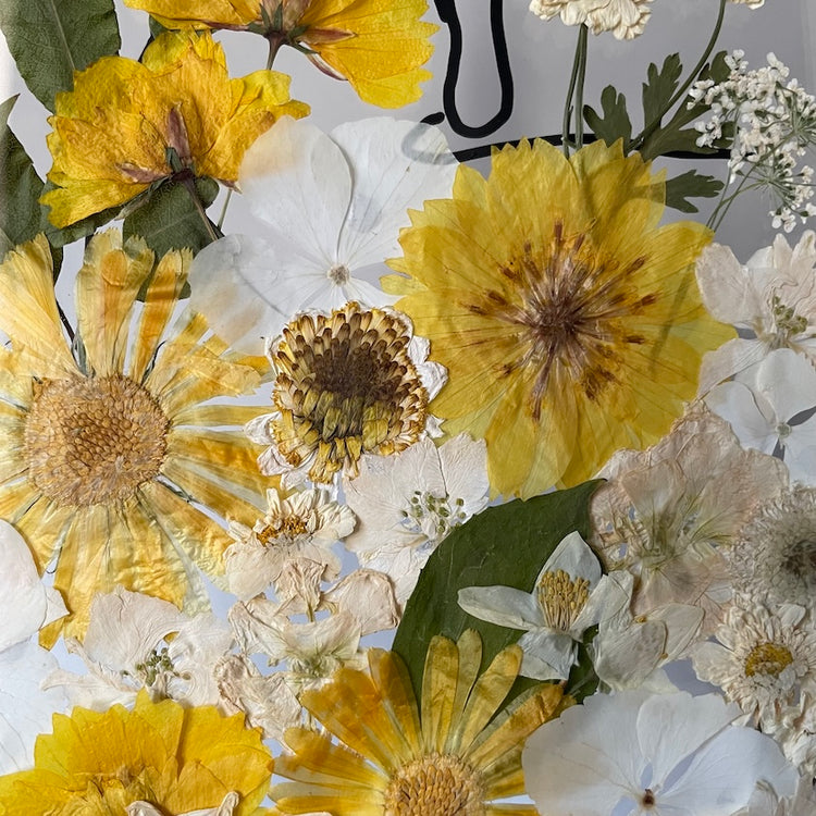 Květinový ručně vyrobený kreslený obraz s květy bílých a žlutých odstínů.