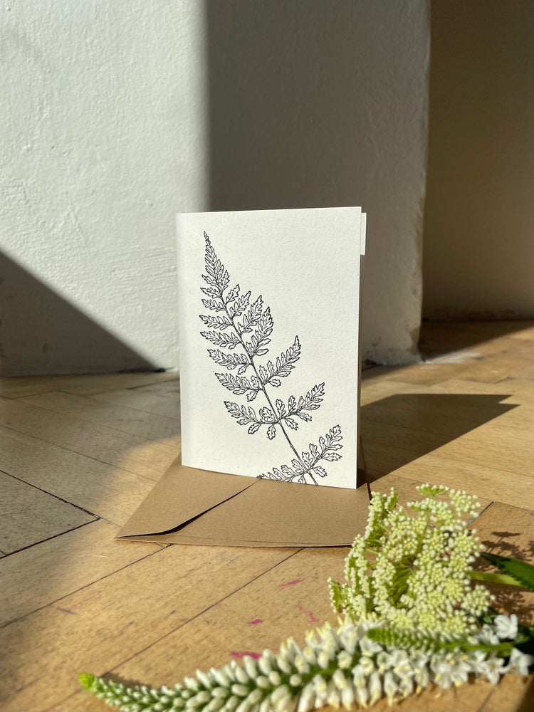 Potěšte své blízké lesním přáním s naší oblíbenou kapradinou vytištěnou na přírodním tvrdém papíru. Uvnitř je papír čistý pro napsání vzkazu od srdce. Darujte jej spolu s obrazem nebo jen tak. ❤️