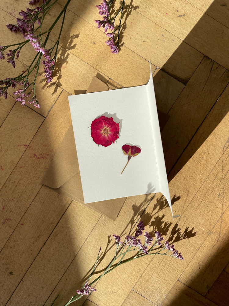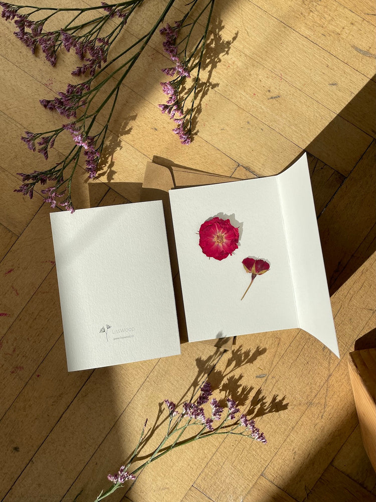 Potěšte své blízké květinovým přáním s pravou vylisovanou růží a jejím poupětem umístěnou uvnitř přání z přírodního tvrdého papíru. Přední i druhá polovina přání je čistá pro napsání vzkazu od srdce. Darujte jej spolu s obrazem nebo jen tak. ❤️