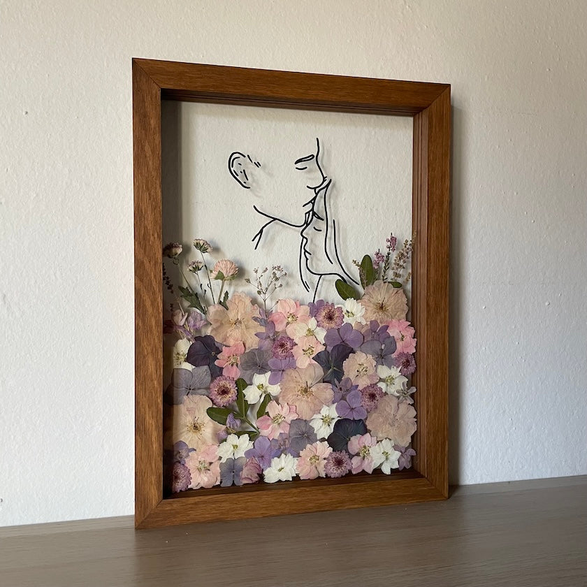 Květiny jsou zasazeny mezi skla a doplněny ručně vyráběným dřevěným rámem, který vzniká přímo v naší dílně. 🪵