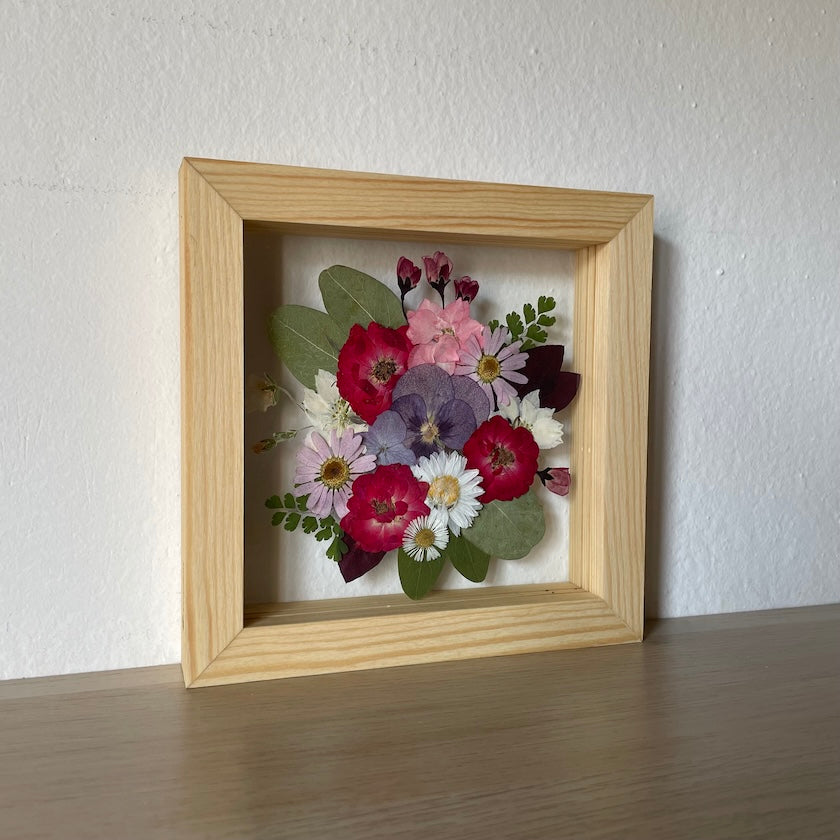 Květiny jsou zasazeny mezi skla a doplněny ručně vyráběným dřevěným rámem, který vzniká přímo v naší dílně. 🪵