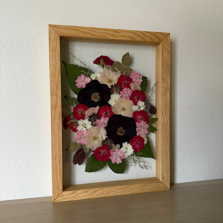 Květiny jsou zasazeny mezi skla a doplněny ručně vyráběným dřevěným rámem, který vzniká přímo v naší dílně. 🪵