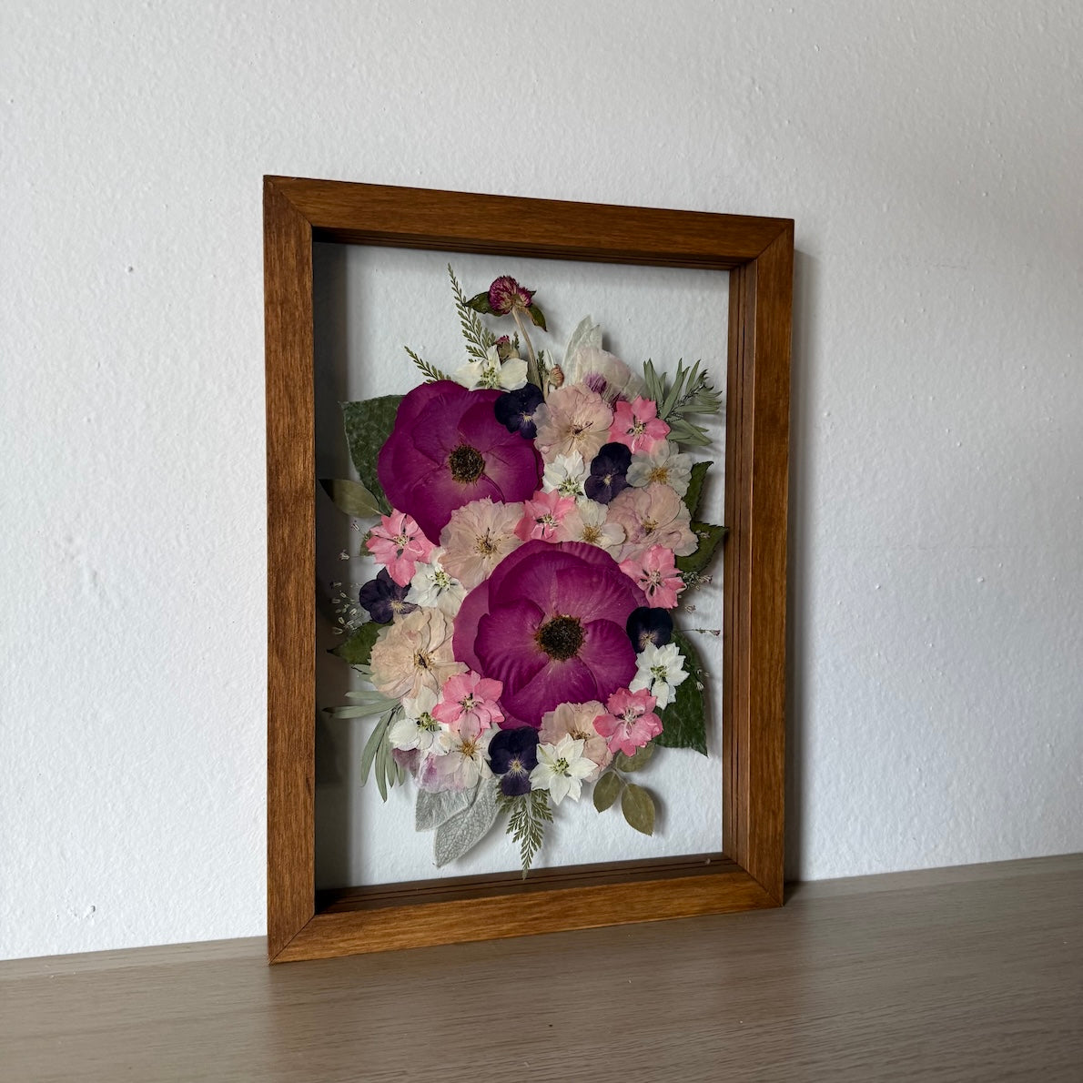 Květiny jsou zasazeny mezi skla a doplněny ručně vyráběným dřevěným rámem, který vzniká přímo v naší dílně. 🪵