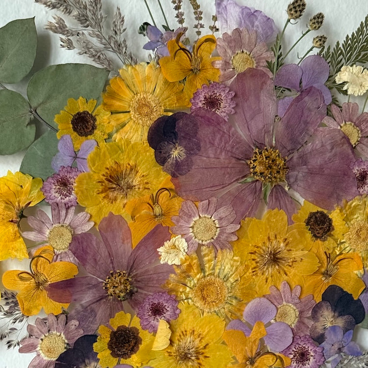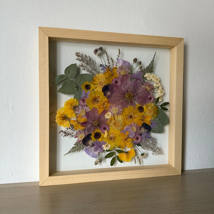Použité květiny a rostliny jsou skutečné, ručně sbírané a šetrně lisované, aby si zachovaly svou přirozenou strukturu, jemnost i barevnost. 🌿 Následně jsou s citem aranžovány do jedinečné kompozice – každý obraz je originál, žádné dva kusy nejsou stejné.