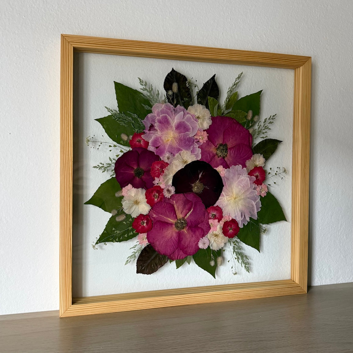 Květiny jsou zasazeny mezi skla a doplněny ručně vyráběným dřevěným rámem, který vzniká přímo v naší dílně. 🪵
