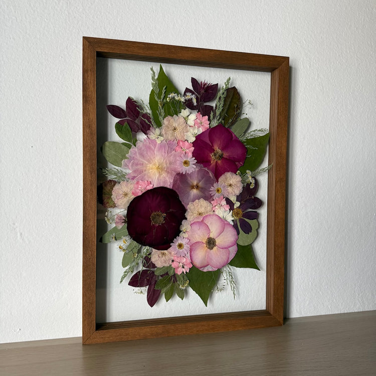 Květiny jsou zasazeny mezi skla a doplněny ručně vyráběným dřevěným rámem, který vzniká přímo v naší dílně. 🪵
