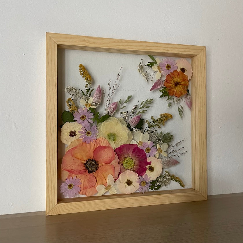 Květiny jsou zasazeny mezi skla a doplněny ručně vyráběným dřevěným rámem, který vzniká přímo v naší dílně. 🪵