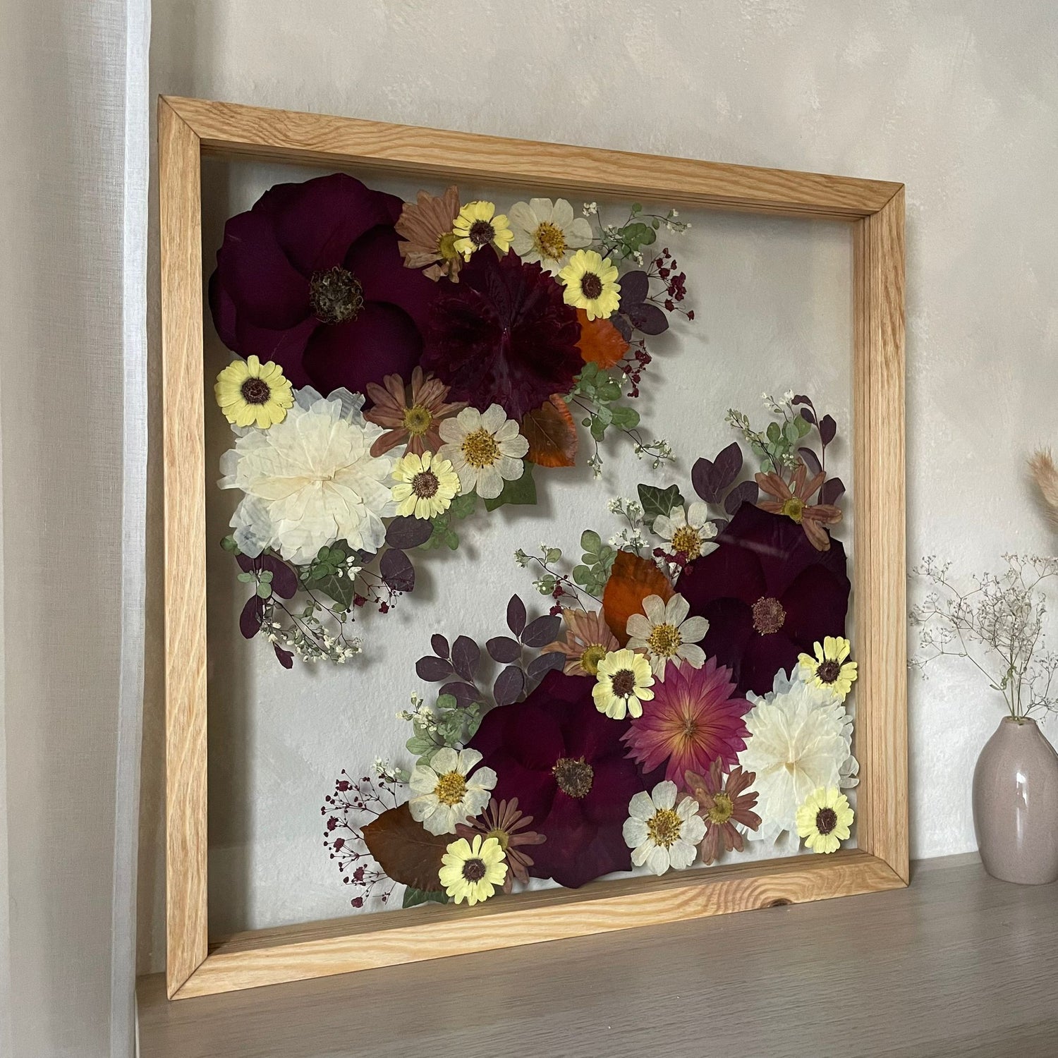 Květiny jsou zasazeny mezi skla a doplněny ručně vyráběným dřevěným rámem, který vzniká přímo v naší dílně. 🪵