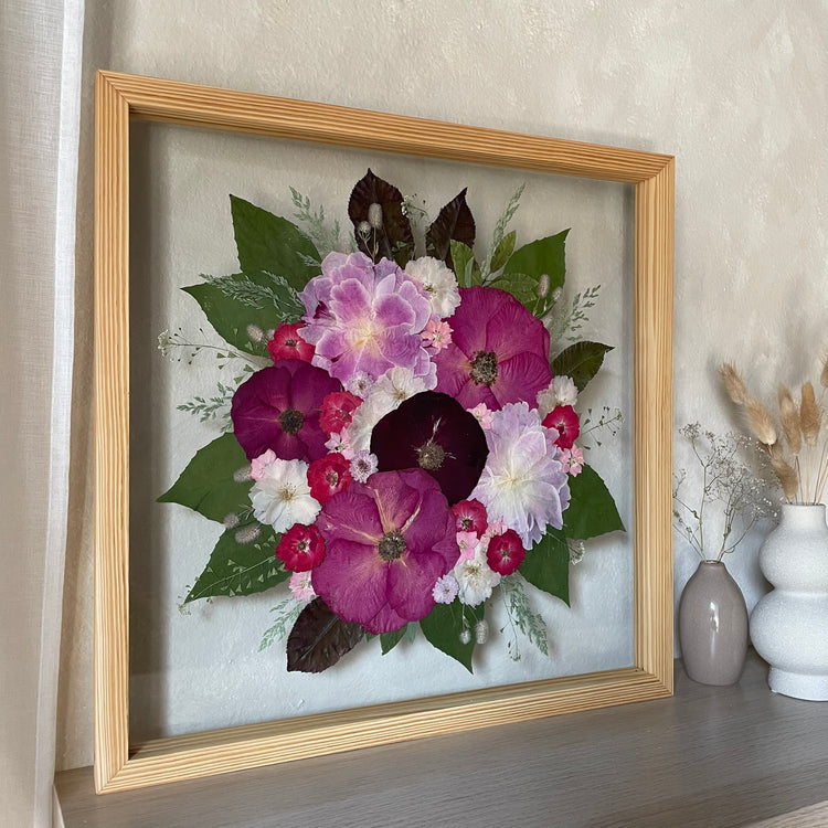 Květiny jsou zasazeny mezi skla a doplněny ručně vyráběným dřevěným rámem, který vzniká přímo v naší dílně. 🪵