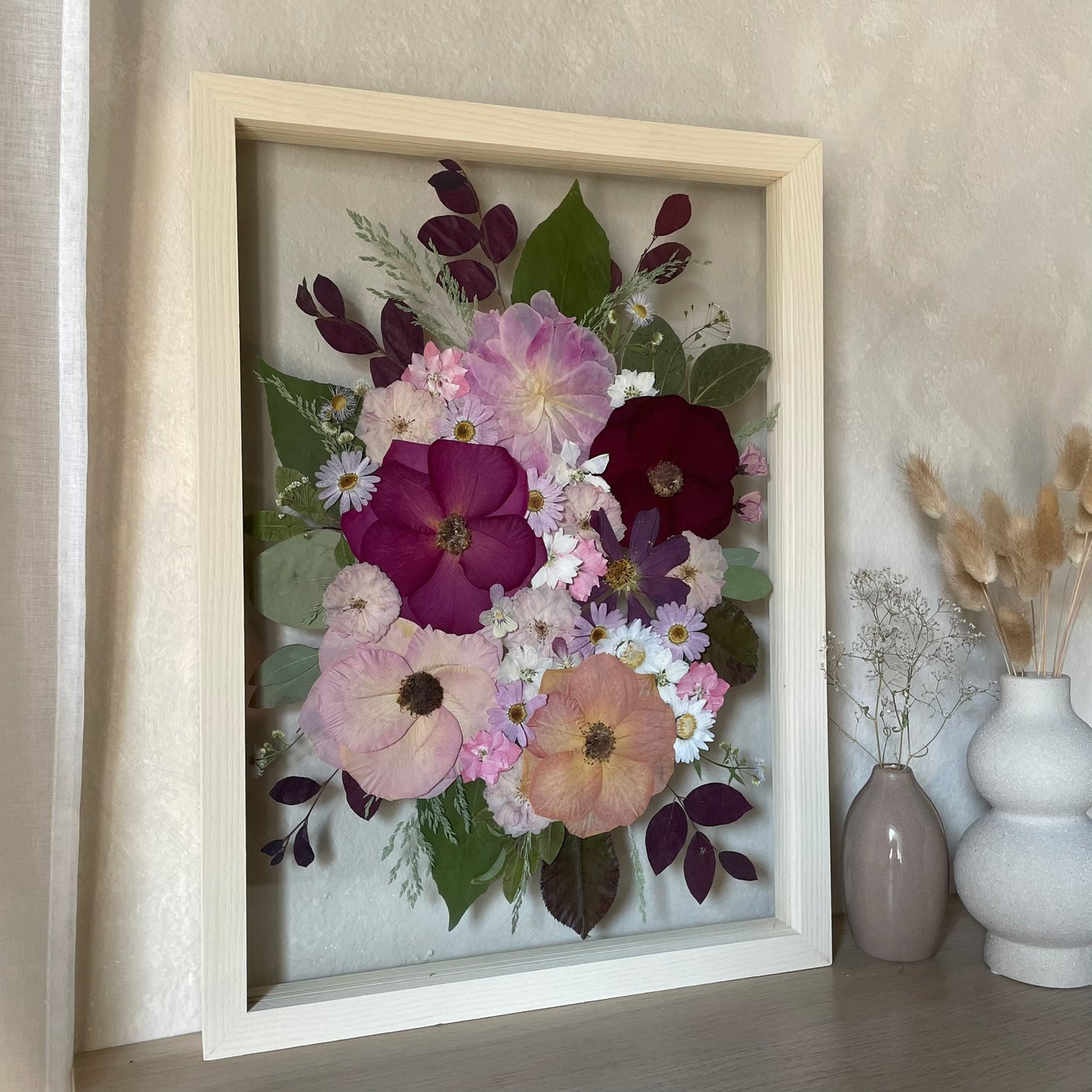 Použité květiny a rostliny jsou skutečné, ručně sbírané a šetrně lisované, aby si zachovaly svou přirozenou strukturu, jemnost i barevnost. 🌿 Následně jsou s citem aranžovány do jedinečné kompozice – každý obraz je originál, žádné dva kusy nejsou stejné.
