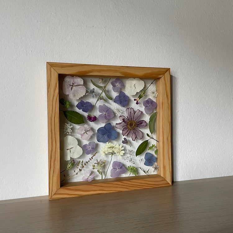 Květinový ručně vyrobený obraz s květy v bílých a fialových barvách, které rostou po celém obrazu. Mezi květy najdete hortenzie, krásenku a mnoho dalšího.