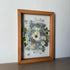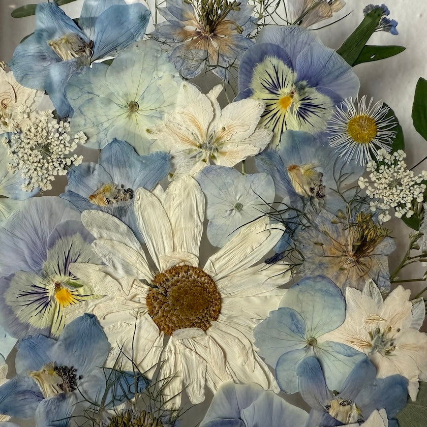 Květinový ručně vyrobený obraz s květy v modrých a bílých barvách, které rostou ze středu obrazu. Mezi květy najdete ostrožky, hortenzie, macešky a mnoho dalšího.