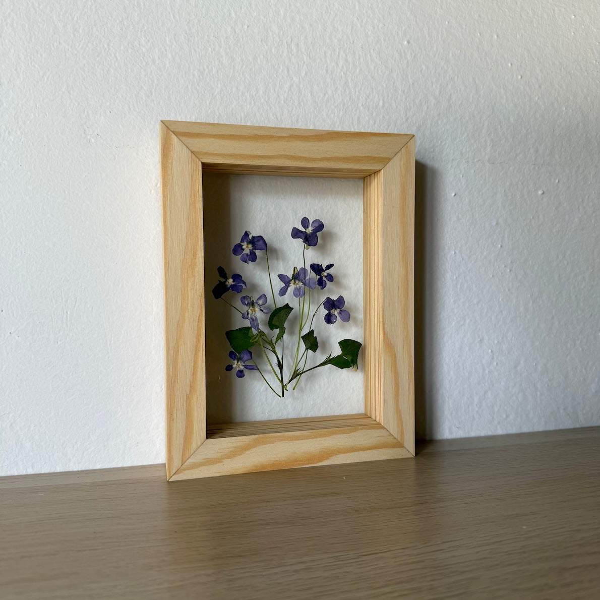 Květinový ručně vyrobený obraz s květy fialek, které rostou ze středu obrazu.