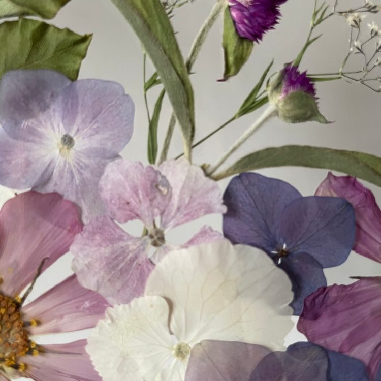 Květinový ručně vyrobený obraz s květy v bílých a fialových barvách, které rostou z rohů obrazu. Mezi květy najdete hortenzie, krásenku a mnoho dalšího.