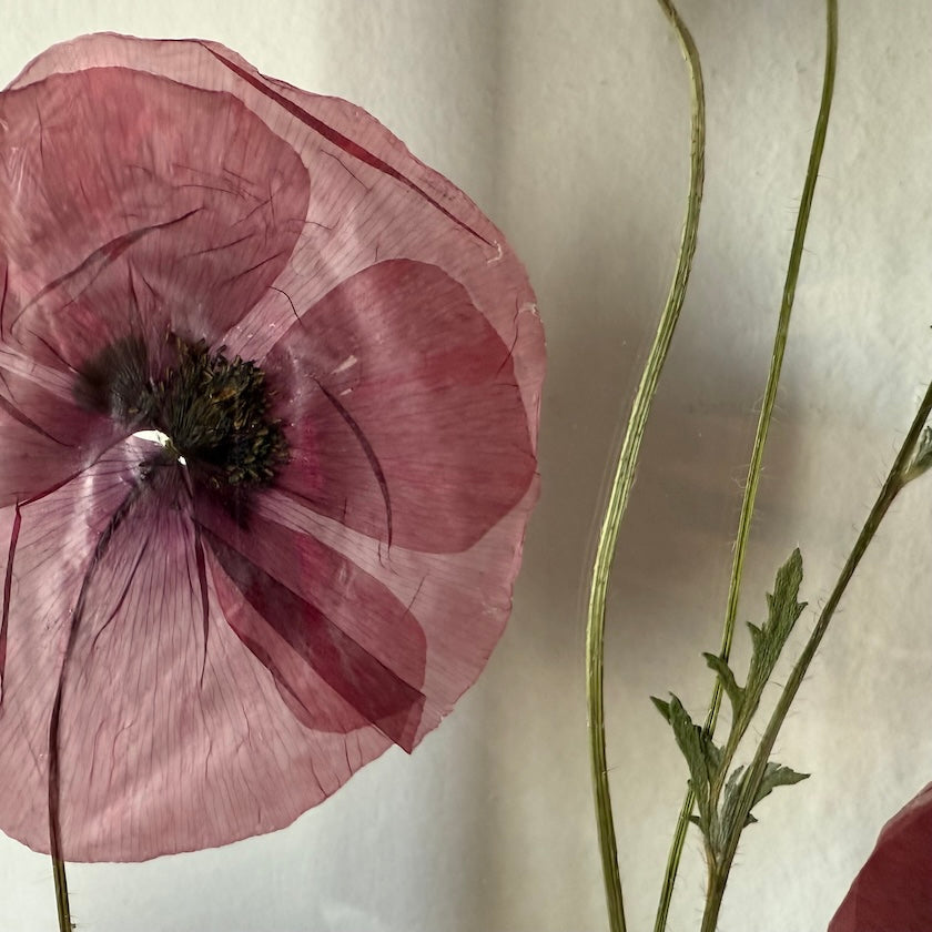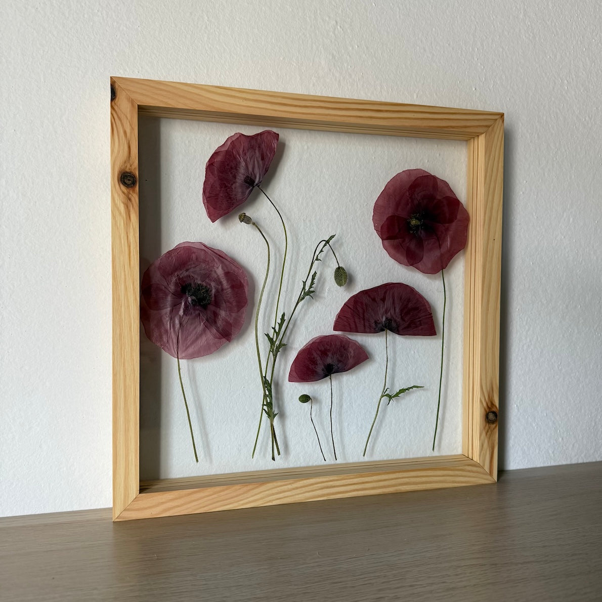 Květinový ručně vyrobený obraz s květy máků, které rostou ze středu obrazu.