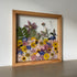 Květinový ručně vyrobený obraz s květy v růžových, žlutých a fialových barvách, které rostou ze spodu obrazu. Mezi květy najdete krásnoočka, růže, ostrožky a mnoho dalšího.