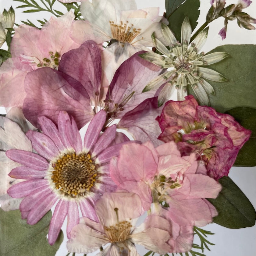 Květinový ručně vyrobený obraz s květy růžových a bílých barev, které rostou ze středu obrazu. Mezi květy najdete ostrožku, květy třešní a mnoho dalšího.