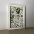 Květinový ručně vyrobený obraz s květy v bílých a modrých barvách, které rostou po celém obrazu. Mezi květy najdete hortenzie, černuchy a mnoho dalšího.