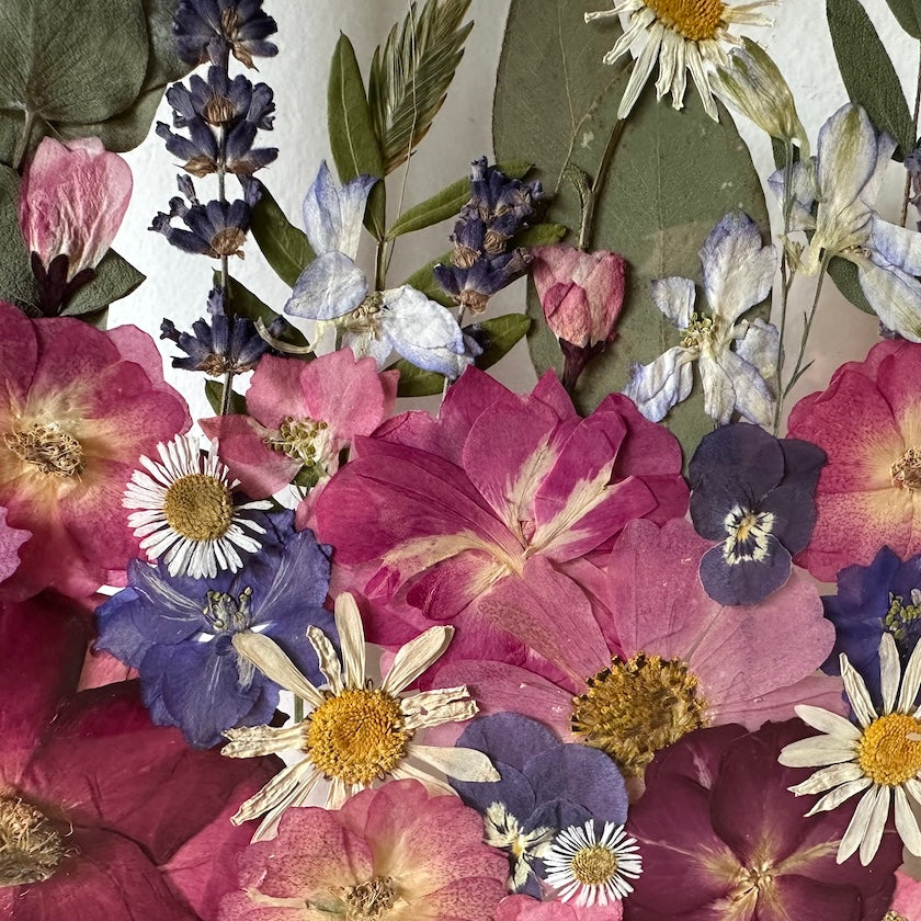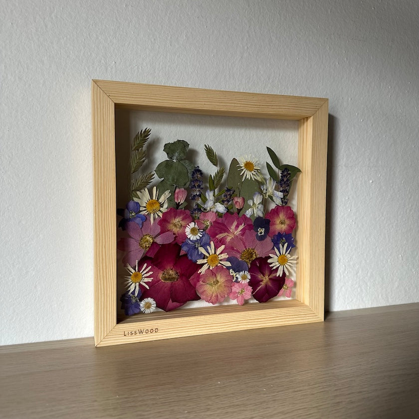 Květinový ručně vyrobený obraz s květy v růžových, vínových a bílých barvách, které rostou ze spodu obrazu. Mezi květy najdete růže, macešky, ostrožky a mnoho dalšího.
