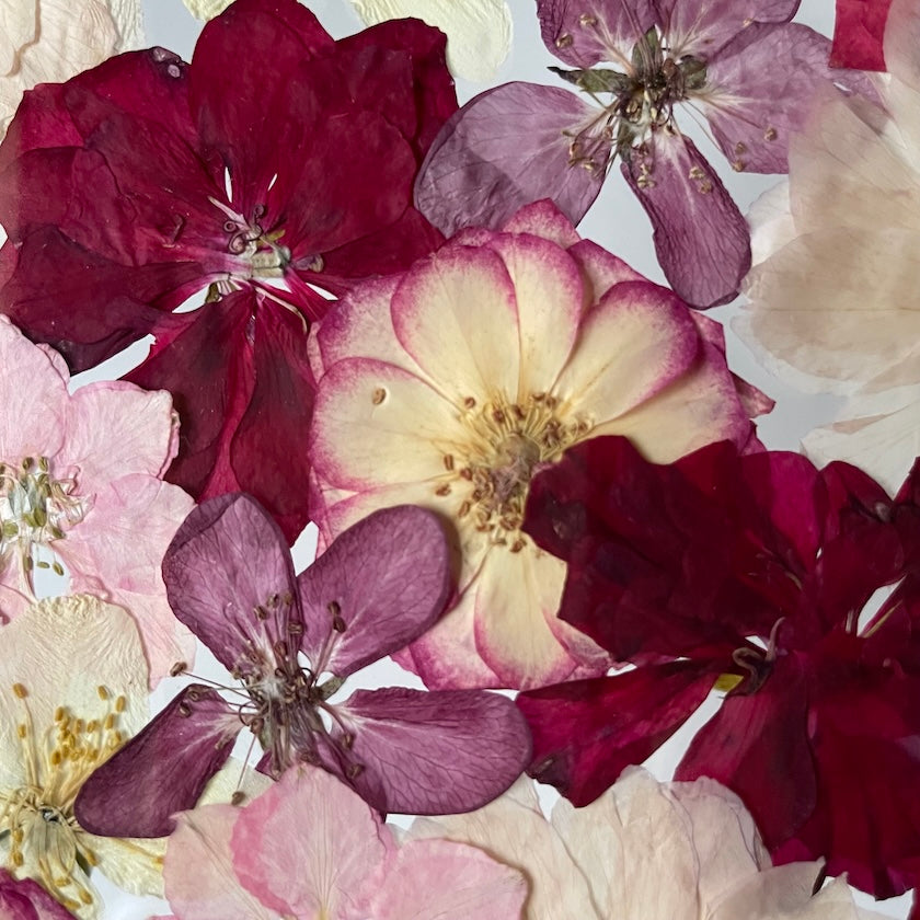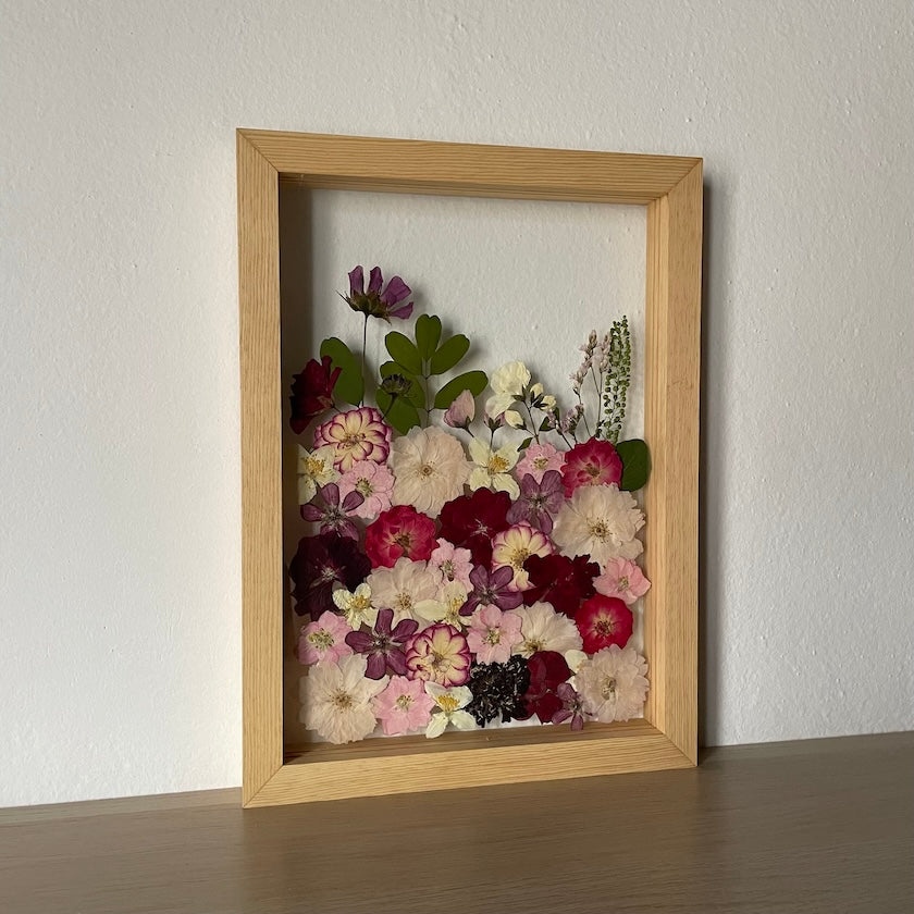 Květinový ručně vyrobený obraz s květy v růžových, fialových a červených barvách, které rostou ze středu obrazu. Mezi květy najdete růže, ostrožky, květy třešní a mnoho dalšího.