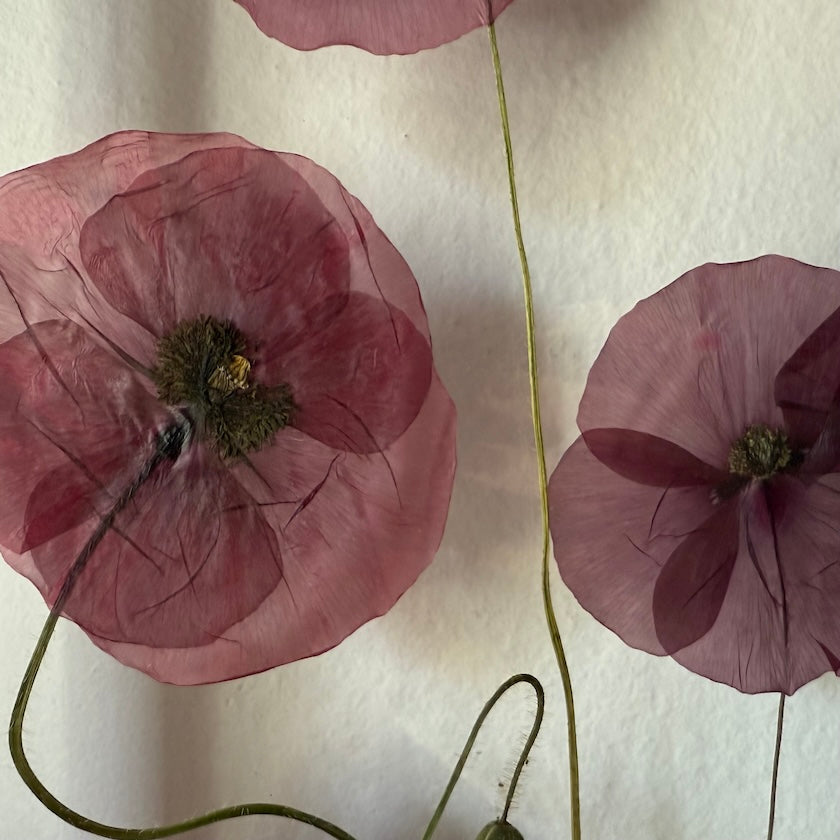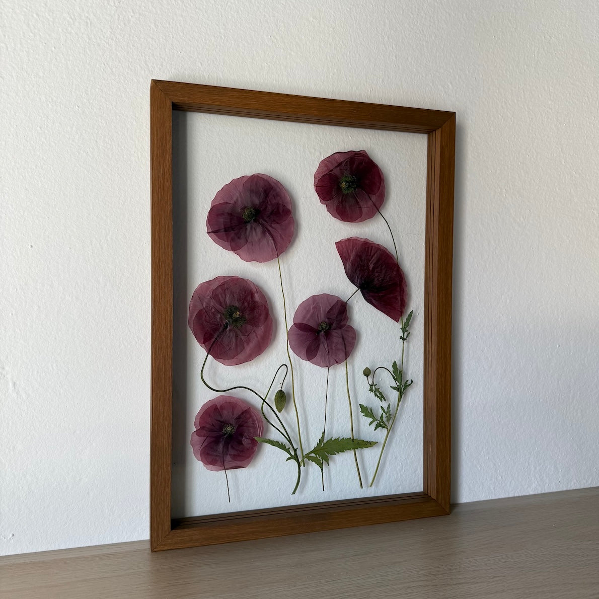 Květinový ručně vyrobený obraz s květy máků, které rostou ze středu obrazu.