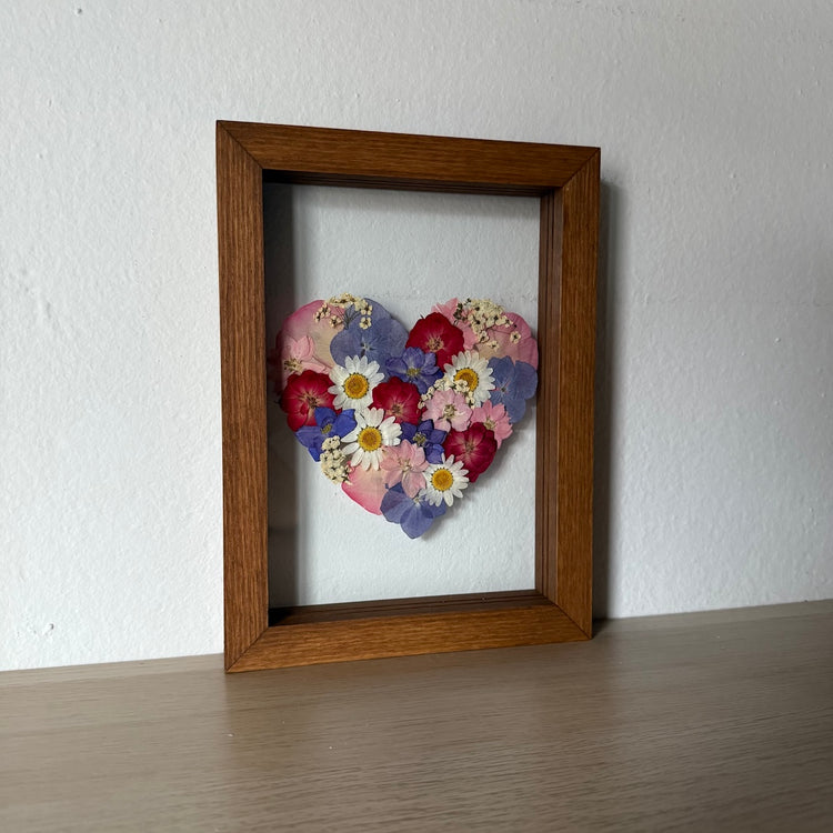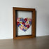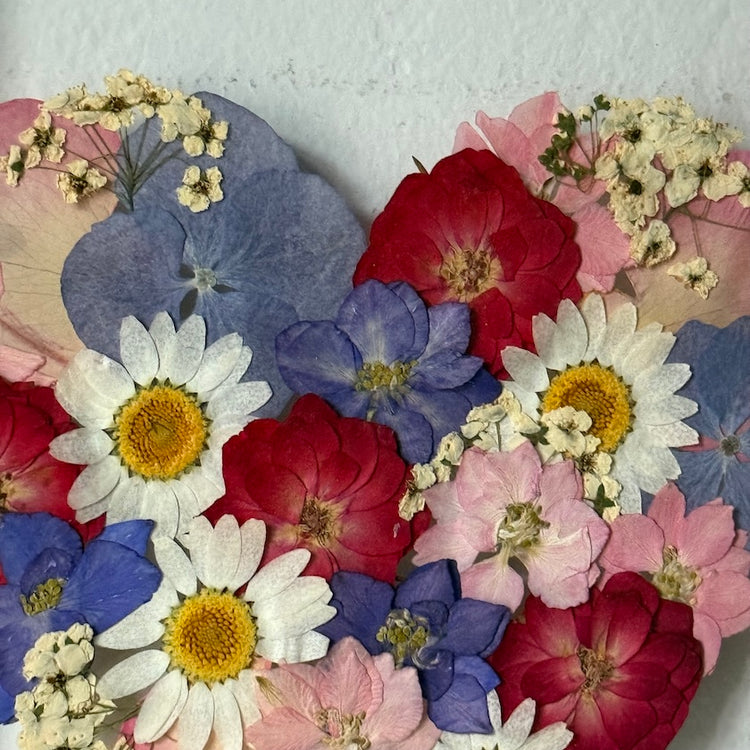 Květinový ručně vyrobený obraz s květy v červených, modrých a růžových barvách, které rostou do tvaru srdce. Mezi květy najdete růže, ostrožky, kopretiny a mnoho dalšího.