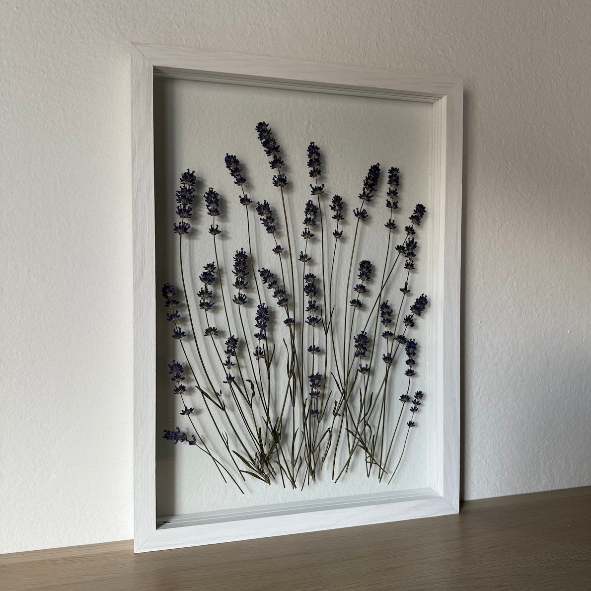 Květinový ručně vyrobený obraz s květy levandule, které rostou ze středu obrazu.