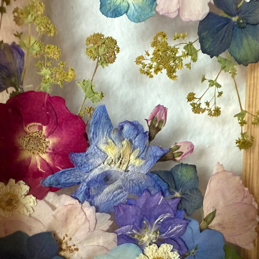 Květinový ručně vyrobený obraz s květy růžových, modrých a bílých barviček, které rostou z rohů obrazu. Mezi květy najdete růži, květy třešní, řimbabu a mnoho dalšího.