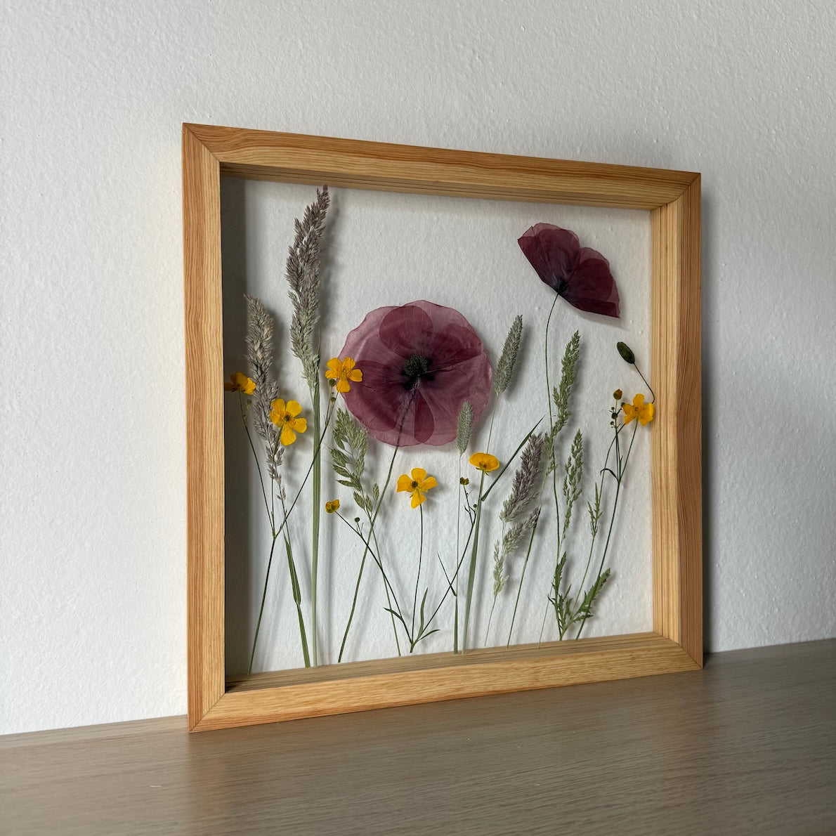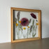 Květinový ručně vyrobený obraz s květy máků a pryskyřníků, které rostou ze středu obrazu.