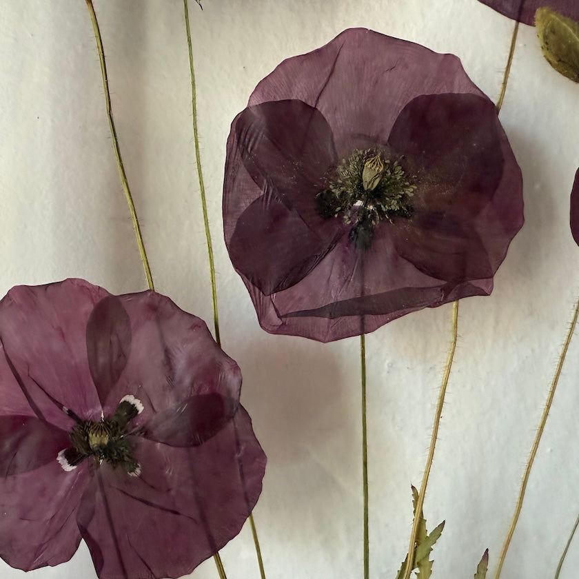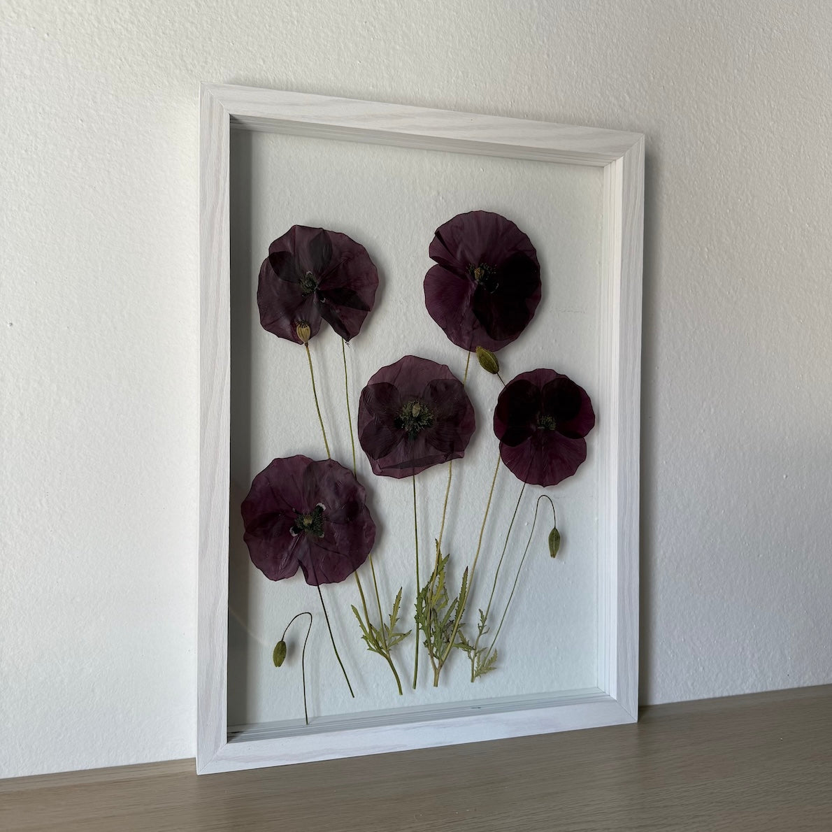 Květinový ručně vyrobený obraz s květy máků, které rostou ze středu obrazu.