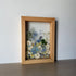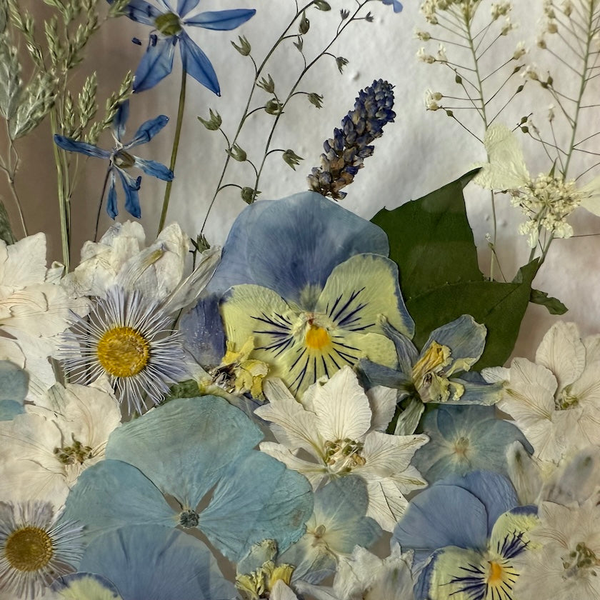 Květinový ručně vyrobený obraz s květy v modrých a bílých barvách, které rostou ze středu obrazu. Mezi květy najdete hortenzie, ostrožky, macešky a mnoho dalšího.