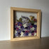 Květinový ručně vyrobený obraz s květy v modrých, fialových a bílých barvách, které rostou ze spodu obrazu. Mezi květy najdete hortenzie, macešky, ostrožky a mnoho dalšího.