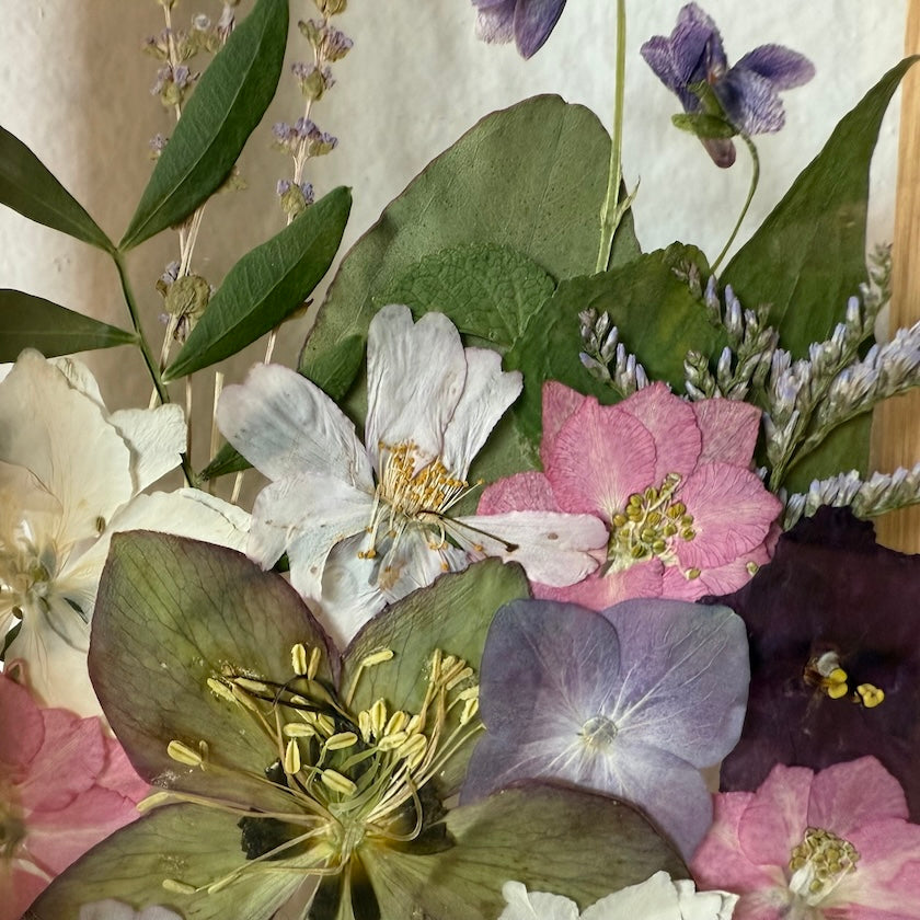 Květinový ručně vyrobený obraz s květy růžových, fialových a bílých barev, které rostou ze spodu obrazu. Mezi květy najdete čemeřici, ostrožky a další.
