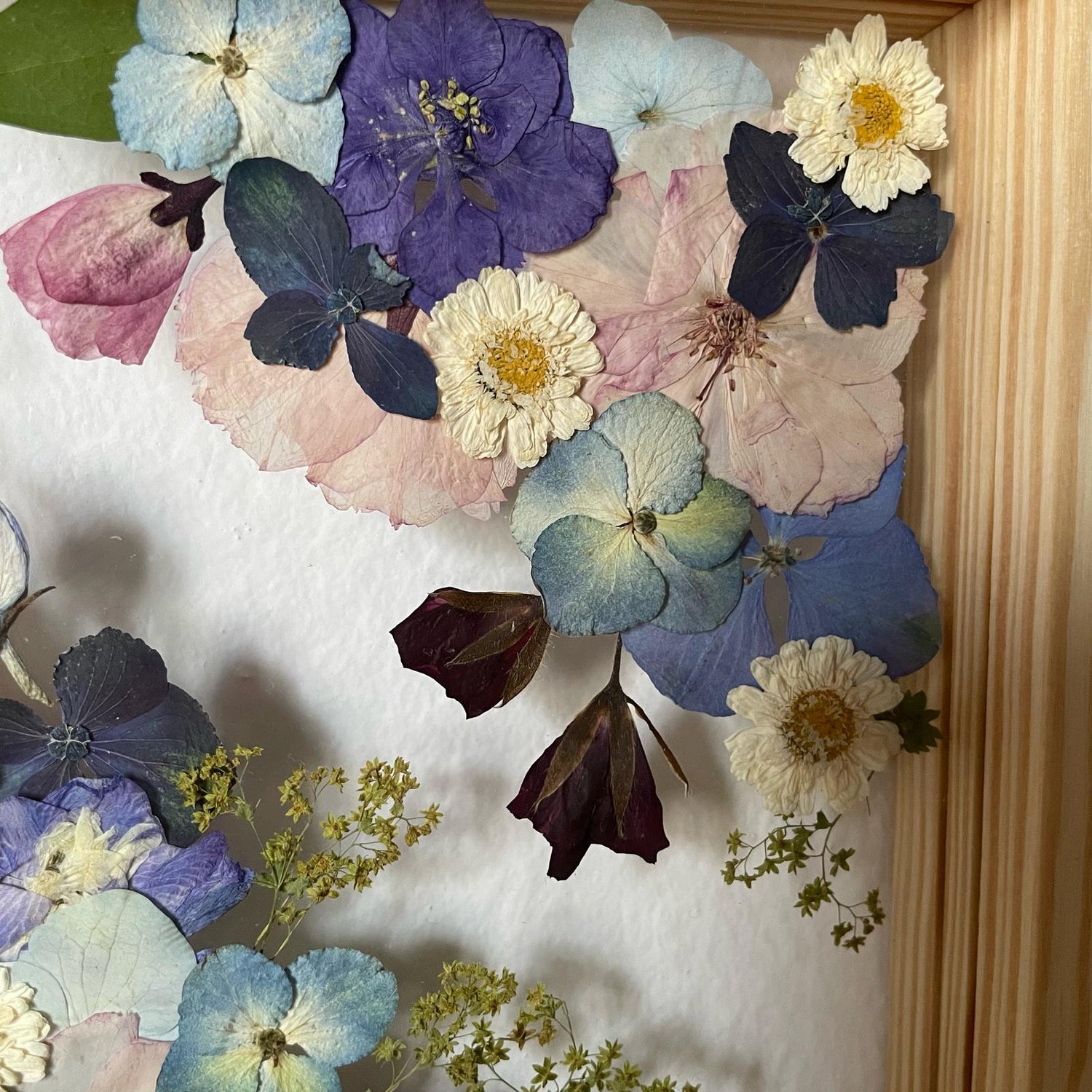 Květinový ručně vyrobený obraz s květy modrých, růžových a bílých barviček, které rostou z rohů obrazu. Mezi květy najdete hortenzie, květy třešní, ostrožky a mnoho dalšího.