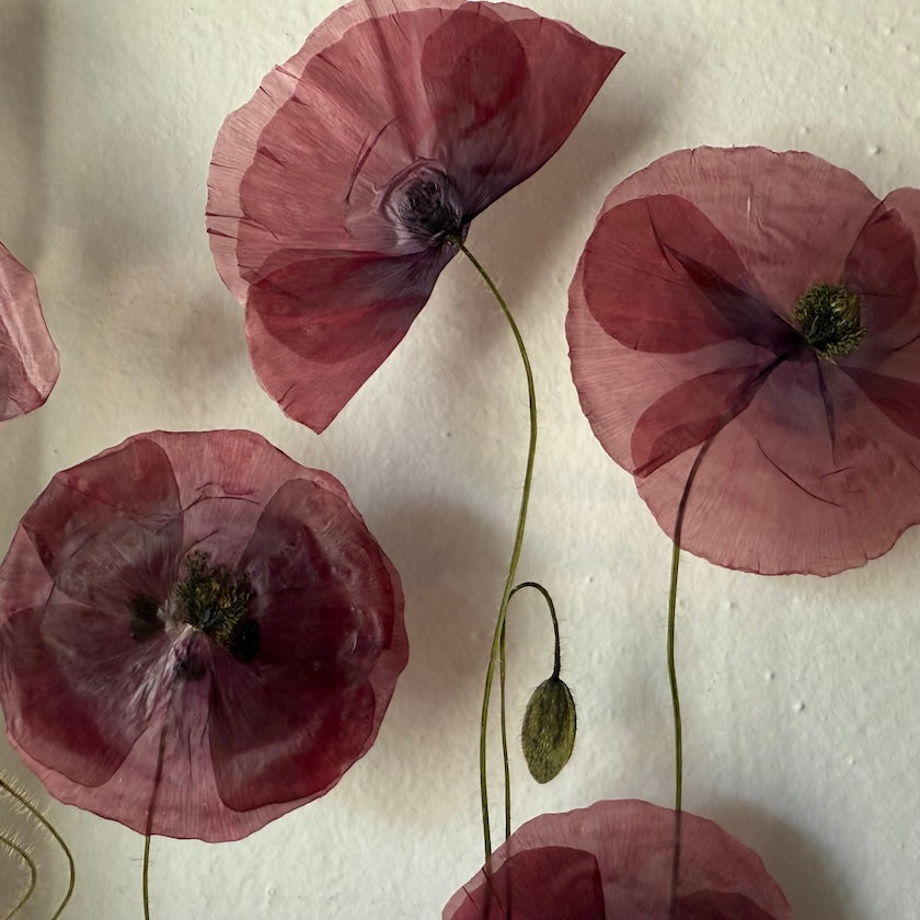 Květinový ručně vyrobený obraz s květy máků, které rostou ze středu obrazu.