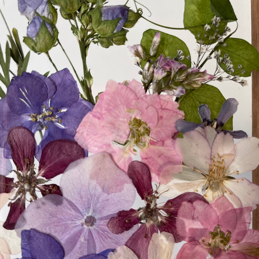 Květinový ručně vyrobený obraz s květy růžových, fialových a modrých barev, které rostou ze spodu obrazu. Mezi květy najdete hortenzie, ostrožky a další.
