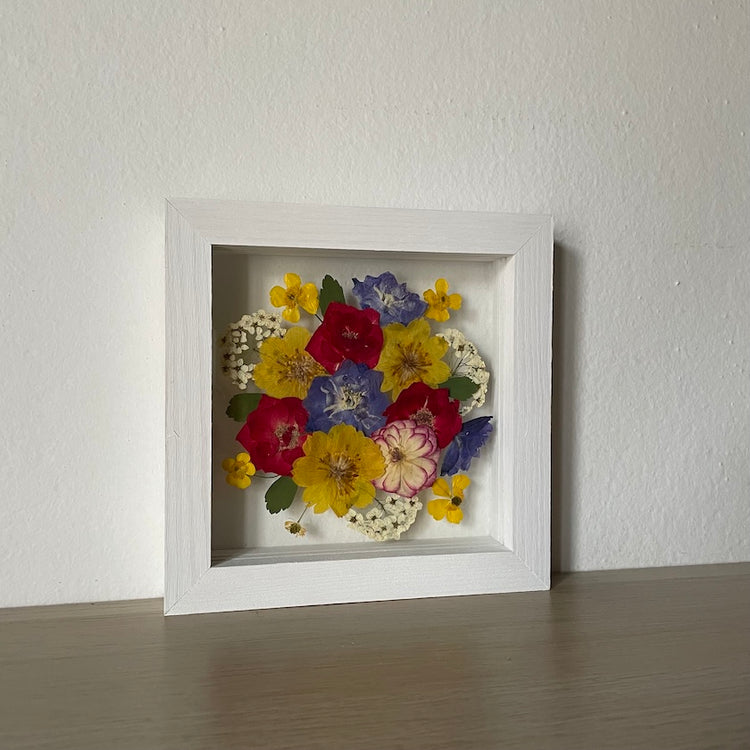 Květinový ručně vyrobený obraz s květy červených, modrých a žlutých barviček, které rostou ze středu obrazu. Mezi květy najdete pryskyřníky, růže a mnoho dalšího.