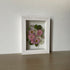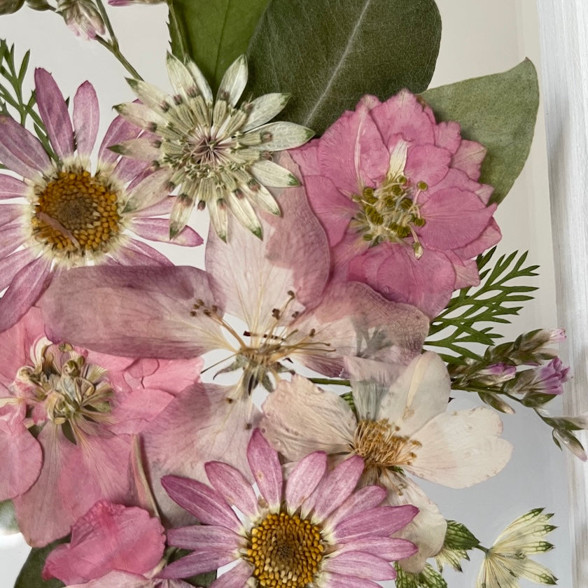 Květinový ručně vyrobený obraz s květy růžových a bílých barev, které rostou ze středu obrazu. Mezi květy najdete ostrožku, květy třešní a mnoho dalšího.