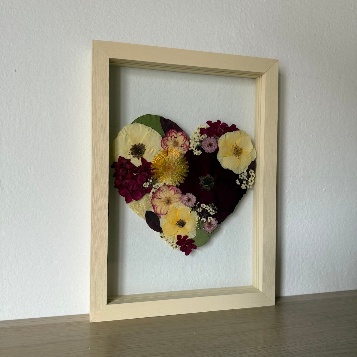 Květiny jsou zasazeny mezi skla a doplněny ručně vyráběným dřevěným rámem, který vzniká přímo v naší dílně. 🪵