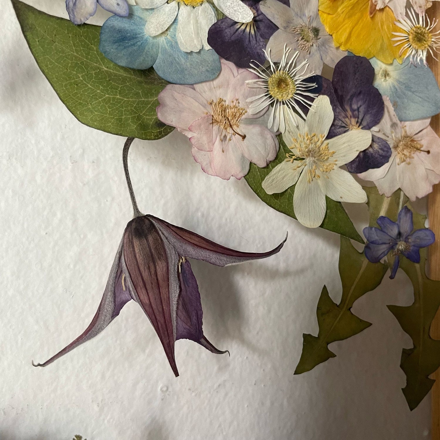 Květinový ručně vyrobený obraz s květy v modrých, růžových a bílých barvách, které rostou z rohů obrazu. Mezi květy najdete ostrožky, macešky, čemeřice a mnoho dalšího.