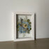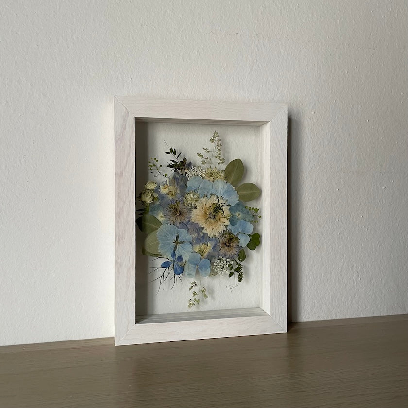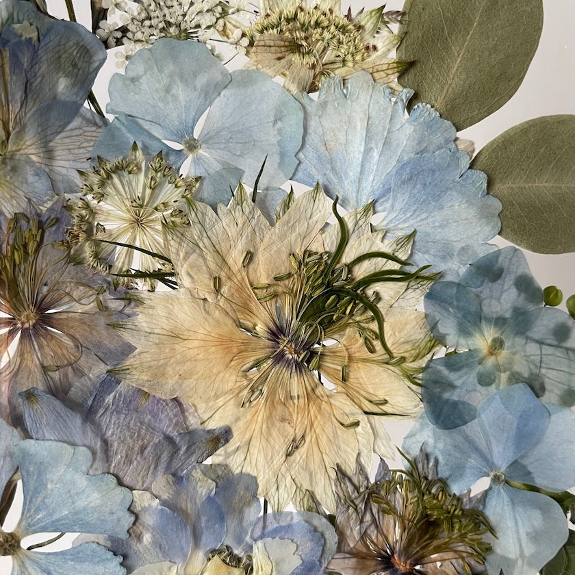 Květinový ručně vyrobený obraz s květy v modrých a bílých barvách, které rostou ze středu obrazu. Mezi květy najdete hortenzie, ostrožky, černuchy a mnoho dalšího.
