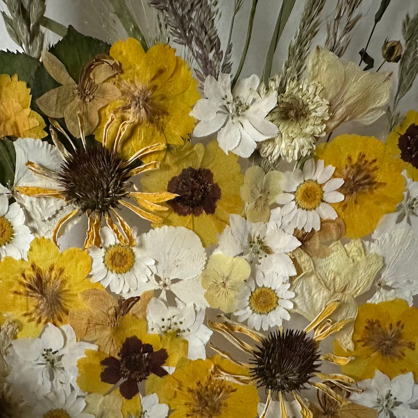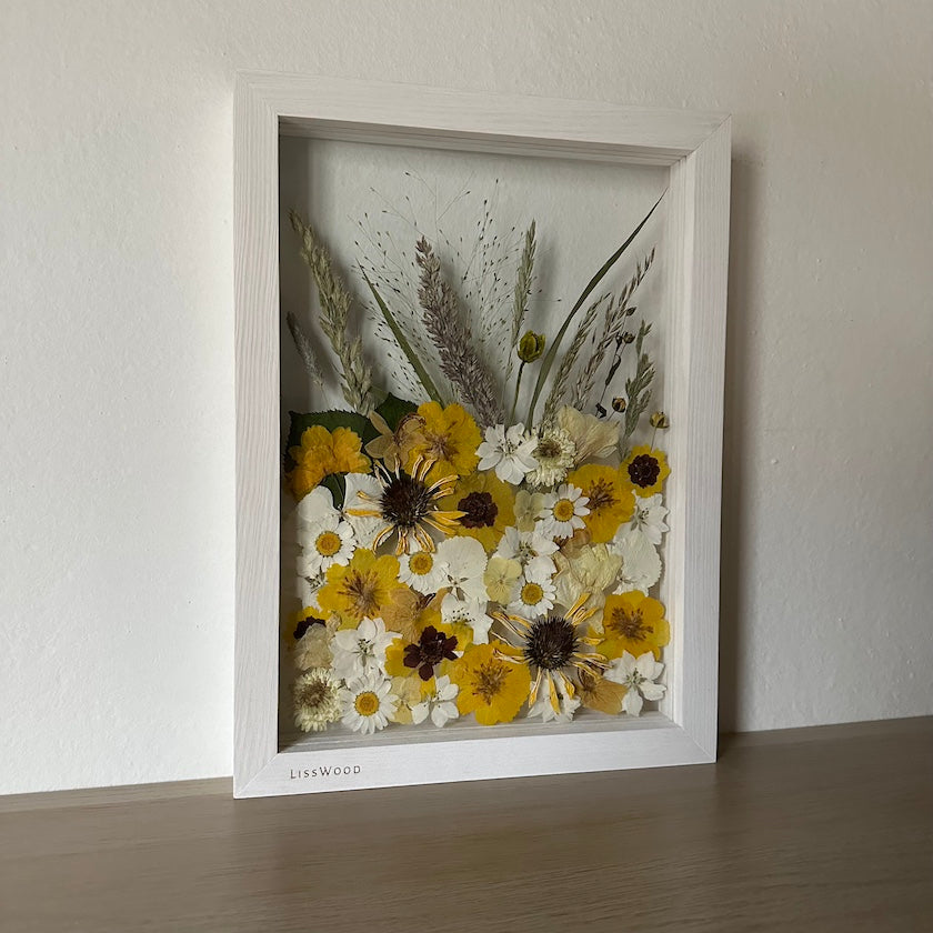 Květinový ručně vyrobený obraz s květy ve žlutých a bílých barvách, které rostou zespodu obrazu. Mezi květy najdete ostrožky, krásnoočka, macešky a mnoho dalšího.