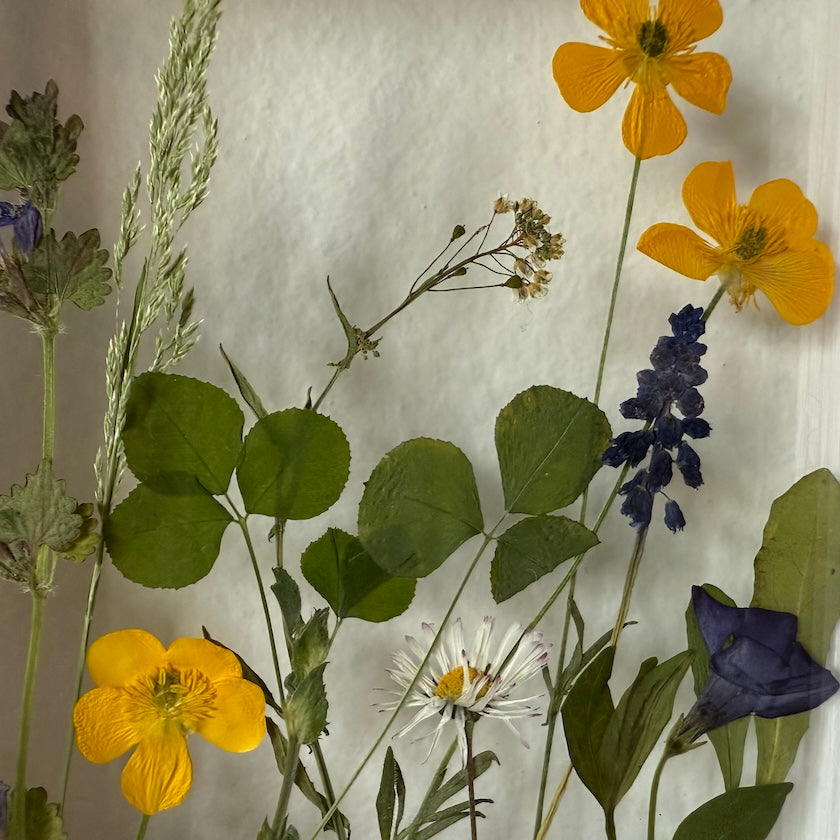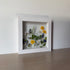 Květinový ručně vyrobený obraz s květy jaterníku, pryskyřníku a sedmikrásek, které rostou ze středu obrazu.