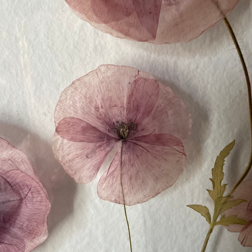 Květinový ručně vyrobený obraz s květy máků, které rostou ze středu obrazu.