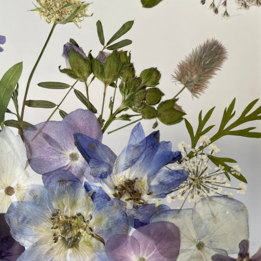 Květinový ručně vyrobený obraz s květy bílých a modrých barev, které rostou z rohů obrazu. Mezi květy najdete hortenzii, ostrožky a další.