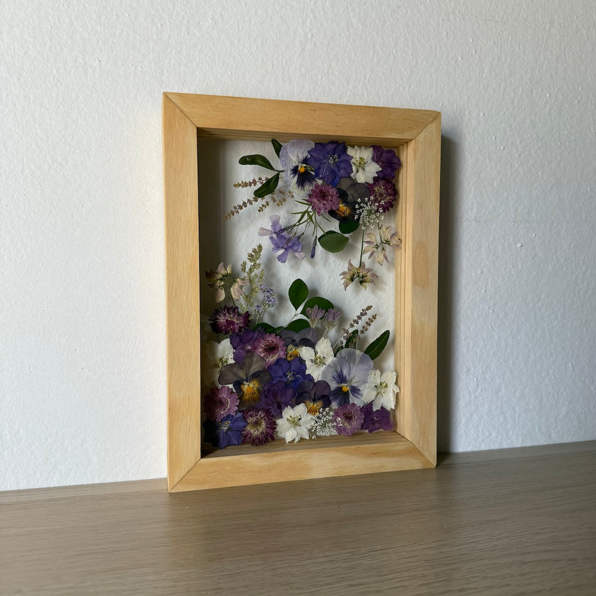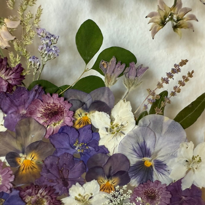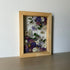 Květinový ručně vyrobený obraz s květy v modrých, fialových a bílých barvách, které rostou z rohů obrazu. Mezi květy najdete statici, ostrožky, macešky a mnoho dalšího.
