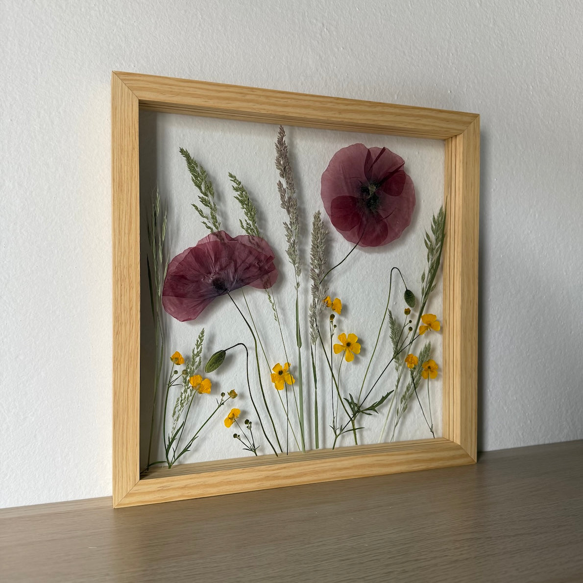 Květinový ručně vyrobený obraz s květy máků a pryskyřníků, které rostou ze středu obrazu.