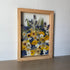 Květinový ručně vyrobený obraz s květy v modrých, žlutých a bílých barvách, které rostou ze spodu obrazu. Mezi květy najdete ostrožky, kopretiny, chrpy a mnoho dalšího.